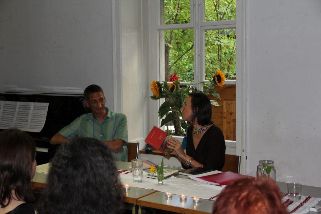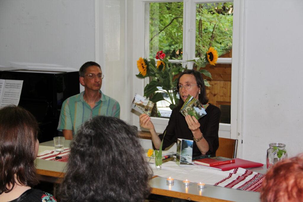 Jeff Kochan, der englische Übersetzer von Halyna Petrosanyaks Prosa, hat uns ausführlich die Autorin und ihre Werke vorgestellt. Halyna Patrosanyak las eigene Gedichte auf Ukrainisch und Deutsch vor. Darunter waren auch Gedichte, die sie erst kürzlich, mit Bezug auf den Krieg in der Ukraine, geschrieben hat. Sowohl die Gedichte über die traurigen Ereignisse in Bucha als auch über das “heilige Getreide” - Weizenfelder, die von der russischen Armee niedergebrannt wurden, haben uns alle sehr berührt.