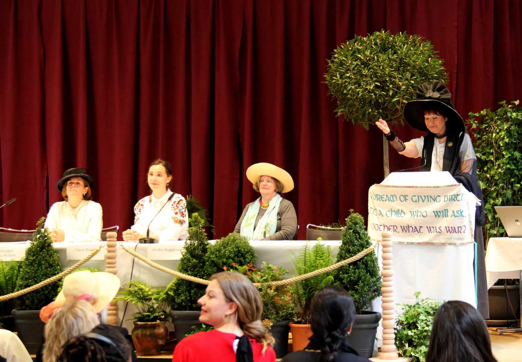 Mit den Worten «Please close your eyes and imagine May 1919…" führt Helena Nyberg, Mitglied des Vorstands von WILPF Schweiz, die Teilnehmenden zurück in die Vergangenheit. Zahlreiche Frauen in historischen Kostümen betreten den Raum und setzen sich. Jane Addams, Vorsitzende der Frauenkonferenz von 1919 erhält das Wort. Für den Dokumentarfilm, den die Kooperative Clapham Film Unit live im Zürcher Glockenhof dreht, spielen die Frauen in einem rund stündigen Akt die Diskussionen auf dem Weg zu zukunftsweisenden Resolutionen von damals nach. Auch Clara Ragaz tritt auf, gespielt von ihrer Verwandten Laura Huonker.