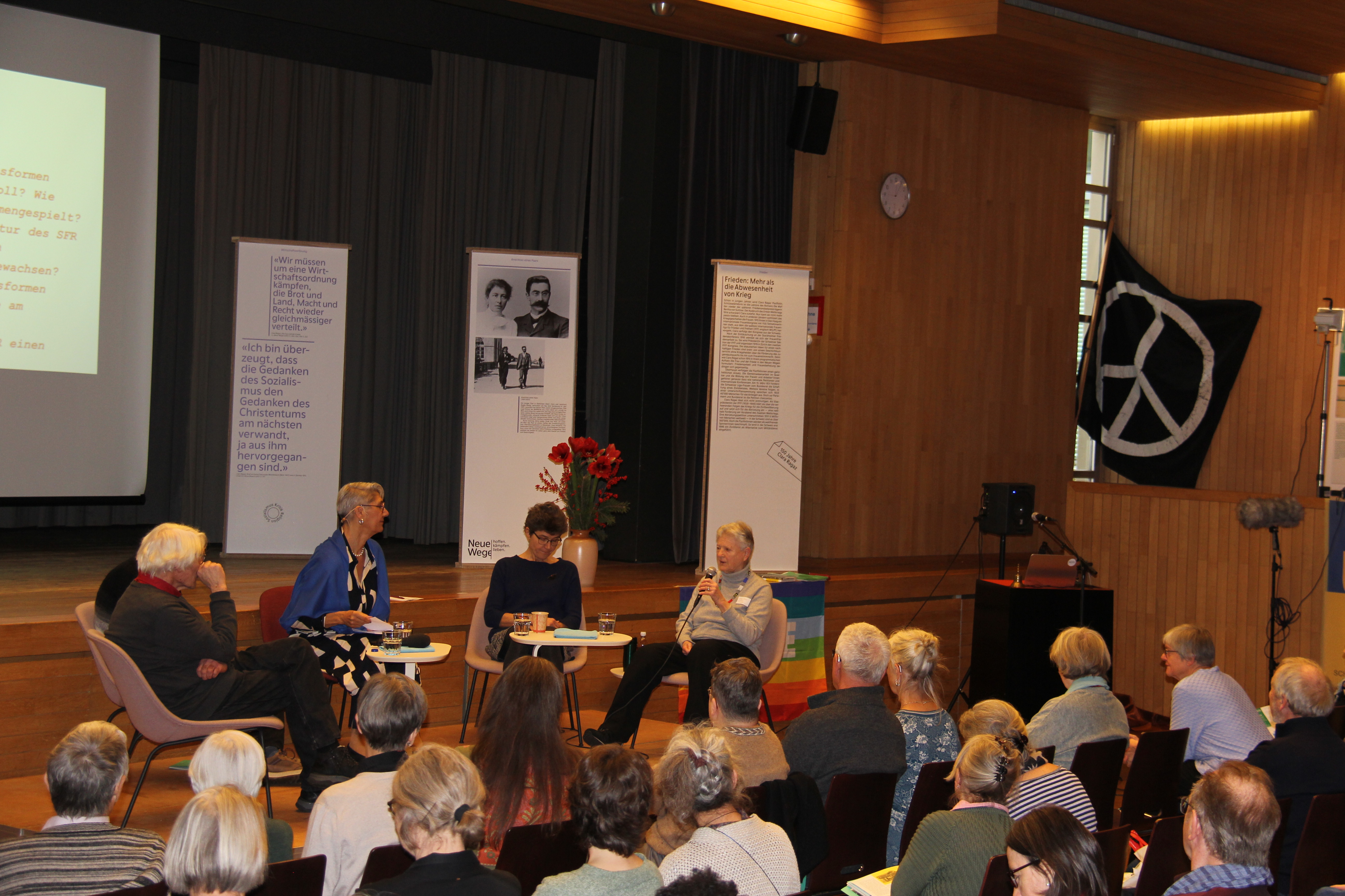 Die Mitarbeit von Frauen in konflikt- und kriegsbezogenen Verhandlungen führt erwiesenermassen eher zu friedlichen Lösungen. Lisa Mazzone bekräftigte, dass wir uns weltweit für Abrüstung und Demilitarisierung einsetzen müssen, Kriegsmaterialexporte sind zu verbieten, der Atomwaffenverbotsvertrag ist zu ratifizieren. Den Tag beschloss ein Podiumsgespräch mit Lisa Mazzone, Stella Jegher und den drei LeiterInnen der Workshops, das von NoraMae Omotayo Herzog moderiert wurde, die auch durch den ganzen Tag begleitete. Im Saal war eine Ausstellung zu 150 Jahre Clara Ragaz zu besichtigen. Clara Ragaz war 1945 Mitgründerin des Schweizerischen Friedensrates. Ausserdem waren Portraits von engagierten Personen wie Jules Humbert-Droz, Hansjörg Braunschweig, Verena Ritter oder Ruedi Tobler, die den Friedensrat massgeblich geprägt haben. Im Foyer präsentierten sich verschiedene Friedensorganisationen, und im Saal konnte man in Büchern zu Friedensfragen der Buchhandlung mille et deux feuilles schmökern.